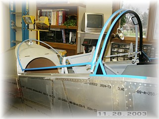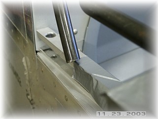 Now comes the moment of truth. I slid the canopy frame towards the rear to check the rear clearance of the tube on the side of the fuselage. The clearance is close but more than enough. You can make minor adjustments by sliding the rear canopy track side to side to get even clearance on both sides. I fit the front pivot points for the canopy locks and tack welded them in place.