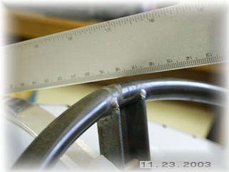 What seemed to work for me was to place the canopy track about 1 1/2" above the rear bulkhead deck, With the rear bow temporarily taped in place, I checked to ensure adequate clearance for the hold down pins. If they are not low enough to adequately engage the hold down bracket, you can shift the center canopy track forward and re-adjust. When the rear bow stands more upright, the pins are lower. At this point I tack welded the rear bow to the side rails.