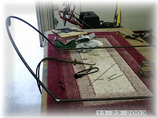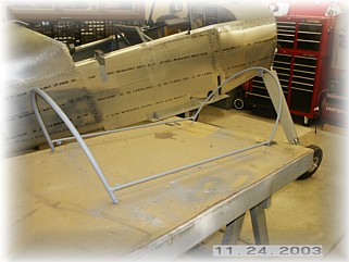 Now that I'm sure everything fit, I took the frame over to my bench and welded everything together. After thoroughly cleaning the frame, I went ahead and primed it. This is the most difficult, and the most critical part of the assembly. Even though the frame has been custom welded to fit the airframe, it still needs tweaking in order for it to fit and function perfectly. After some trail and error, I came up with the following procedure for getting the frame whipped into shape. First, the assumptions. At this point, the frame should be fully assembled with the front and rear bows bent to the proper shape. The front canopy locks should be assembled in their final configuration and on the frame. The canopy wheel trucks should also be assembled and on the frame.