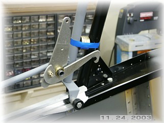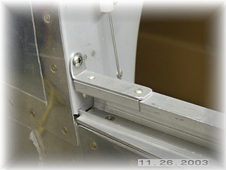 Once again from the Tom Martin file of tips, I borrowed this idea. When removing the canopy frame over and over, the plans call for you to remove the front trucks by removing the screw. Tom came up with this nifty idea to remove a small piece of the rear rail and rivet it to the clip. So that's what I did. As a result, I couldn't find any reason not to permanently attach the trucks to the canopy frame, do I did so with steel pop rivets. That will eliminate the unsightly screw in the front face of the front canopy bow.