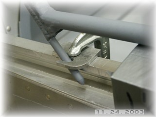 5) Now, slide the rear canopy track into place without moving the frame. Check the vertical distance between the top of the rear bow and a straightedge held along the top surface of the track. You should have 1/8" clearance here. If not, remove the track and bend the rear bow to get the right height. This may also require you to remove the frame from the fuselage. If it does, bend the rear bow on your bench, and go back to the first step. If not, then continue. 6) Tape the rear canopy track in place. This now establishes the center of the rear canopy bow. Release the front canopy locks and slide the canopy frame slightly back to check the clearance along the sides of the fuselage. If one or both side touch the sides, determine whether one side of the rear bow needs to be bent or both sides. I think the mistake that some folks might make is that they just grab the rear bow and pull it apart. That will change the center point of the rear bow and throw the alignment pins out of whack. If the rear bow does not hit the side of the fuselage, skip down to step 8. 7) Once you've determined which side to bend, carefully remove the frame from the fuselage and take it over to your workbench. Measure the distance between the hold down pins. Remember, these should still be in the proper alignment with the fuselage. Now, use your tubing bender to make VERY SMALL bends the appropriate side of the rear bow outward. Check you measurement of the alignment pins and hammer the pins either in or out to get the same measurement as before. Put the frame back on the fuselage and go back to STEP 1!. Yes, I said step one. You'd be amazed at how small bends in one area changes the geometry of the frame in other areas. By going back to the first step, you will systematically reset the frame to fit properly. 8) You now have the rear canopy track sitting in the right fore and aft position to hold the canopy frame at the right height. It is also centered left and right so that the canopy frame doesn't hit the fuselage. Drill the rear track to the fuselage at this point per the instructions in the manual. Double check that the frame slides freely fore and aft and doesn't hit anything.