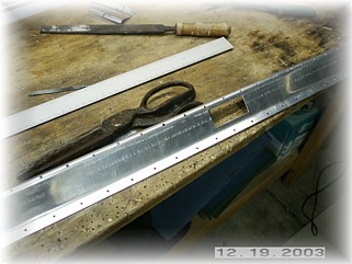 After I received my roller tool, I went ahead and rolled the top edge of the side skirt for the Plexiglas. One thing that I noted is that the inside piece that holds the back of the Plexiglas in place really effects the way the side skirt fits. I bent these pieces pretty aggressively to get them to conform to the shape of the Plexiglas. This helped to hold the side skin next to the Plexiglas. Before bending these inside pieces, the side skin would not fit up against the glass smoothly and was pressing very hard against the fuselage skin. I also deviated from the plans at this point to add a doubler across the front edge of the canopy. I did this on my RV-6 as well. I do not like riveting the Plexiglas to the frame directly, even the soft pop rivets. So I cut two pieces of aluminum and back drilled them to fit. This will give the forward edge of the canopy a nice finished look. The width of the strips is the same as the tube underneath it so no real visibility is lost. When I glass the windshield on, the glass strips will line up with these aluminum strips for a perfect fit.