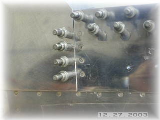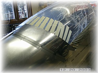 Over on the bench, I rolled the rear braces to get them in the right shape. I found that you can get the rear edge to lay flat if you put in a lot of diagonal roll into the bend. I rolled and rolled the skin across a 4" pipe to get the right fit until the skins fit WITHOUT being held in place with tape. Once I had them in place, I taped them down and drilled the holes per the plans. The result is a very tight fit without gaps. At the top, I trimmed the skins for a butt joint. When the track cover is riveted in place, it will hold the skins flat against the fuselage near the tracks.