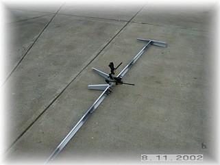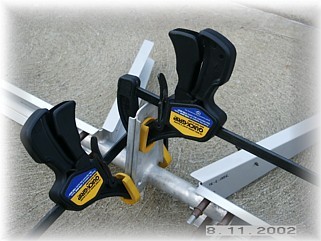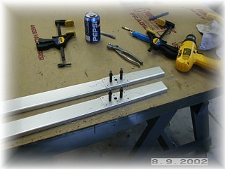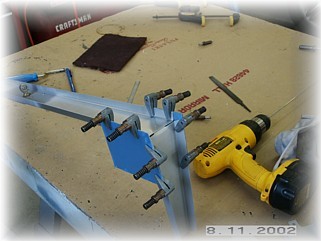 In order to get the two horns aligned with one another, I drilled ONE of the horns to the inside rib by centering it along the horizontal axis of the rib, much the same way I drilled it to the spar. This now becomes the basis for drilling the other horn. I then took the two spar assemblies out into my driveway and laid them flat. I clamped the horns together as shown. I then held the inside ribs down so that both of them were flat. While doing so, I drilled the attach holes through the other rudder horn and rib. Now I know that they will both be in the same plane (Ha ha, pun intended!) This completes the skeletons. Now it's time to build the jigs and attach the skins. |
