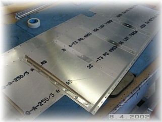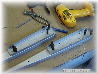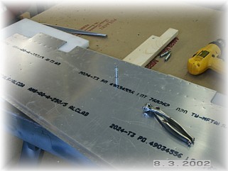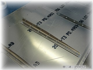 I laid the stiffeners between the wood strips, marked the centerline, and then laid the pre-punched skin over the it. Make sure you have the skin oriented properly before drilling any holes. (e.g.- top up the skin up and the bottom side down on the stiffener)