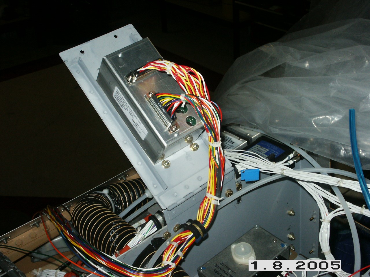 Here's a picture from underneath looking up with the boots installed. I finally got around to mounting my engine monitor. Since I don't need to install this in the instrument panel, I mounted in the center of the boot cowl area. It's not needed in the panel because the EFIS display will take its place. A serial output from the monitor drives the EFIS display, so this unit can go behind the panel. I made a flip up tray and routed the wires forward. |