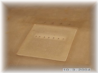 Now came the tricky part. Fiberglassing the foam inside the scoop is not an easy job, but there are a couple of tricks that make the job tolerable. First, I applied a runny mixture of micro to the foam with a squeegee. This is referred to as slurry. This fills the pores of the foam and it gives the glass something to hold on to. Next, I laid up two plies of glass on a sheet of aluminum foil big enough to cover the entire area. I then took the glass plies, flipped them over, and used the aluminum foil to press the glass into the corners and to smooth out the lay up. I trimmed the glass that was overhanging the edges and overlapped the plies along the upper edge of the air inlet. When I had it positioned correctly, I removed the foil and tended to any minor corrections.