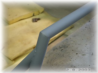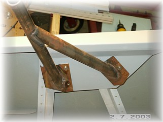 After priming the tubes, I bolted everything up. It fits well. One last note. I did a fair amount of grinding on the mounting pads of the support tubes to get them to fit correctly on the reinforcing plate. I didn't want any part of the steel mounting pads overhanging the reinforcing plate. That would be a good place for clothing or fingers to get caught on. Again, mount the pads where you need to get the right aft measurement and then trim any overhang to get a good fit.