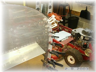 Clamping along the top is very critical. In order for the boot cowl to lay flat, you've got to get the holes drilled with the skins as tight as possible. Once the spacers are installed, I installed the cowl flange strips provided in the kit. These were installed according to the plans. Another trick is to make sure that the parts are pre-bent into the shape of the firewall before drilling them. This is very important. It will help to get the skin to lay flat and not pucker. After drilling the holes along the top through the boot cowl, I removed the boot cowl and clamped up the parts again and drilled the other holes along the top. Again, clamp everything tight as you can. Align the holes with a punch and then set the clamps. Before drilling the plate that covers the flange joint, re-attach the boot cowl. This will hold the firewall at the proper angle.