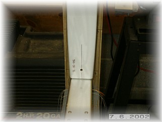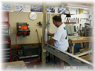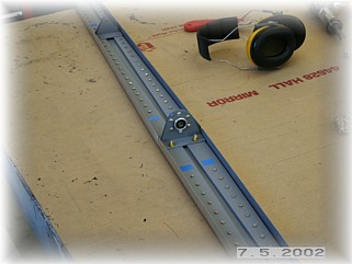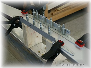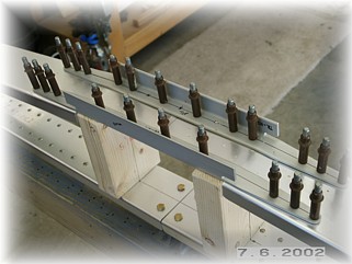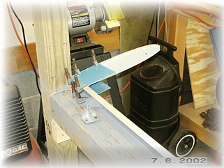 The rear spar is now ready for the jig. I first made a couple of template fixtures of the end and center ribs. These will be used to help level the skeleton in the jig. It is easier to fabricate these now before the ribs are attached to the skeleton. Using the techniques outlined in the plans, I attached hinge brackets to the jig. It's important that these are in a straight line and level with one another otherwise the rear spar will have a bow in it which will cause the elevators to bind as they move up and down. I also permanently attach the end ribs at this time. I do so now because there's no reason not to, and because it helps to stabilize the assembly in the jig.