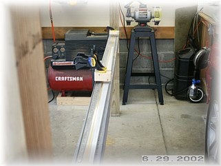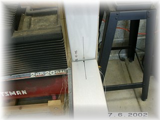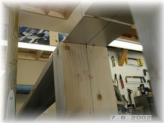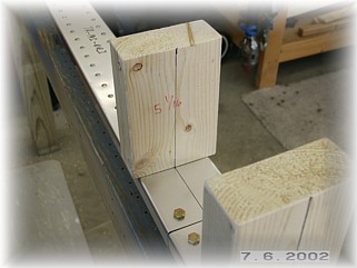The plans call for a spacer of 5 1/16 inches in the center. I made two of these out of 2X4s. I attached the spacers to the spar using drywall screw through the open rivet holes reserved for the inside ribs. I then used a level to draw a vertical line on the spacers. These will be used to align the top spar on the centerline of the rear spar.