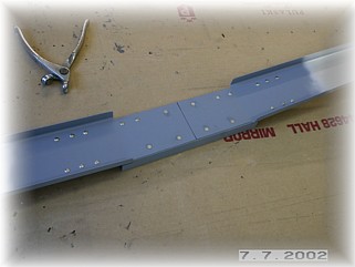 Reassemble the spar and rivet all the parts together. Be sure to mark the holes that are used to attach the ribs and leave these open. Nothing ruins your day like trying to drill out a -4 rivet that's been put in the wrong hole. You can also bolt up the center hinge. Whenever I install nuts and bolts, I add a touch of torque seal to it so that I know that it has been tightened properly. Once the project gets going, it is easy to lose track of all the various nuts and bolts on all the assemblies. The torque seal provides a visual affirmation that it has been tightened.