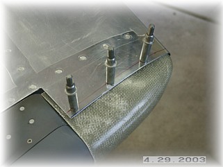 After trimming off the excess glass, I reinstalled the tip and protected the aluminum with some duct tape. I then covered the tip with a dry mixture of microballons in order to get a flush fit with the skin. Once that dried, I sanded the tip smooth and removed it so that I could fill all the pin holes with spot putty.