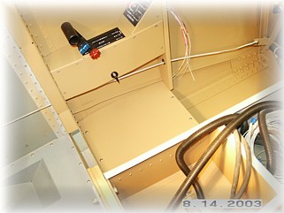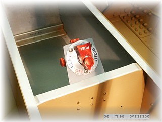 This is what the finished fuel valve looks like installed. This area will be covered with angled panels to cover the bay where all the fuel lines and pump will eventually be installed. That work starts on the next page. |
