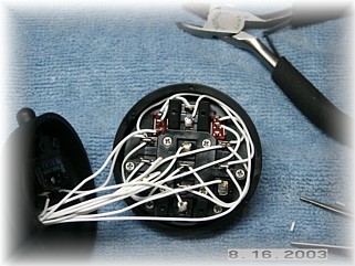 First step for me was to wire up the control stick. I'm using a Ray Allen stick with two extra switches. One of the extra switches is for the autopilot and the other is the flap switch. That meant that I had ten wires to run down the handle. I soldered things up as best I could and assembled the grip on top of the stick. I drilled a hole at the bottom and used a grommet for the wires to exit the stick.